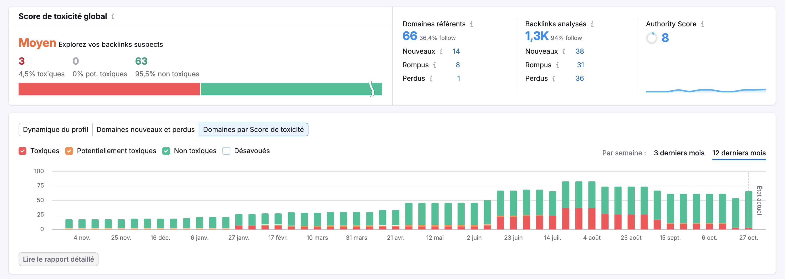 Chez Weboorak, nous utilisons plusieurs outils pour dresser un portrait fidèle de votre profil de liens et identifier les signaux toxiques qui pourraient pénaliser votre classement.