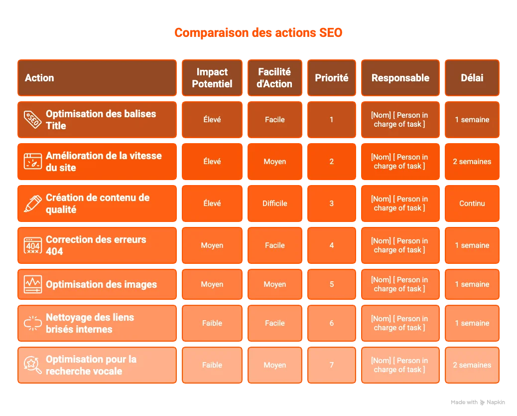 - Fixez des échéances réalistes - la patience est une vertu en SEO ! Comptez 2-3 mois minimum pour voir les premiers résultats significatifs.